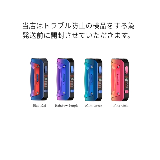 Geekvape S100 (Aegis Solo 2) Box Mod S100 (Aegis Solo 2) 新しいトライプルーフを備えた Mod。 業界をリードする IP68 等級の防水性と防塵性。 画期的な耐衝撃性。 このModは、偶発的なプレスによるコイルの過燃焼やモッドの過熱を避けるために、偶発的なプレス保護設計を使用しています。 第 2 世代の Geekvape Tri-proof Tech により、この mod は IP68 等級の防水および防塵性と、より高いレベルの耐衝撃性を備えています。 1.08 インチの大画面により、製品のすべての詳細が画面に反映され、より優れた視覚体験が提供されます。 ブランド: Geekvape バッテリー: シングル 18650 バッテリー (別売り) 出力:最大100W 出力電圧:最大8.5V 抵抗範囲: 0.1-3ohm 画面: 1.08 インチ TFT ディスプレイ 充電:5V/2A 低電圧警告: 3.3V+-0.1V PCBA 温度アラーム: 85C 最長vaping時間: 10秒 働く温度: -10-40C スタンバイ電流: < 10uA 保管温度: -20-60C 相対湿度: 10% RH- 70% RH スレッド: 510 パッケージ: ギフト用の箱
